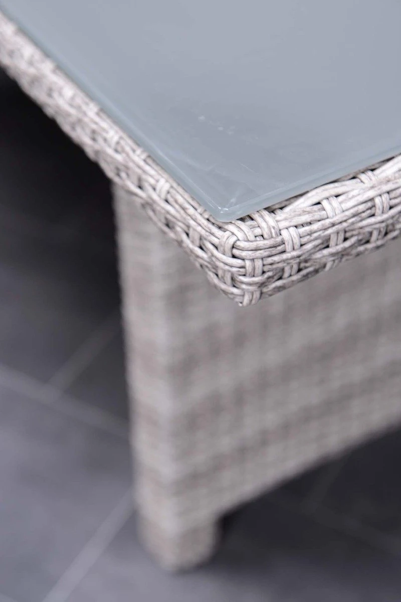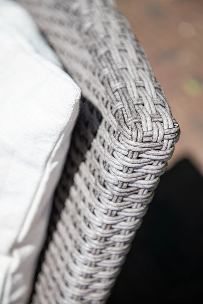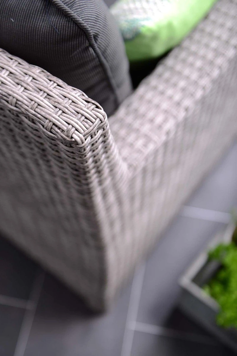 Het hele set heeft een sterk aluminium frame dat bespant is met van hand gevlochten wicker in de kleur organic grey. Het optisch dubbele vlechtwerkdraad uit kunststof zorgt niet alleen voor een luxe uitstraling maar is ook nog vrij makkelijk te onderhouden en weerbestendig. Voor een hoge zitcomfort zorgen de lekker dikke kussens van spunpolyester in de kleur donker antraciet. Verder zijn de kussens vuil- en rotwerend en zorgen voor een echte lounge ervaring. De tafel beschikt over een tafelblad gemaakt van veiligheidsglas.