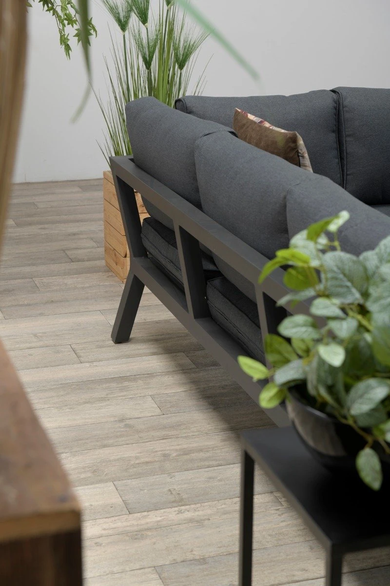 De set bestaat uit twee bankdelen en een tafel. Zowel de hoekbank als tafel hebben een aluminium frame. Hierop is een beschermende poedercoating aangebracht. Aluminium is sterk, weerbestendig en onderhoudsvriendelijk. De comfortabele loungekussens hebben een waterafstotende coating, wat er voor zorgt dat regenwater niet direct wordt opgenomen in de stof. Als de kussens niet worden gebruikt, wordt geadviseerd om deze droog op te bergen.
