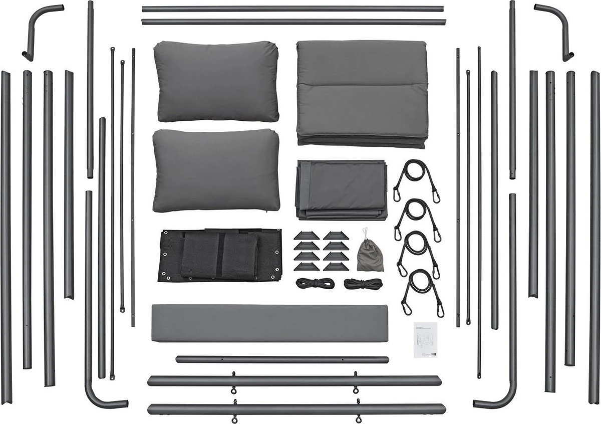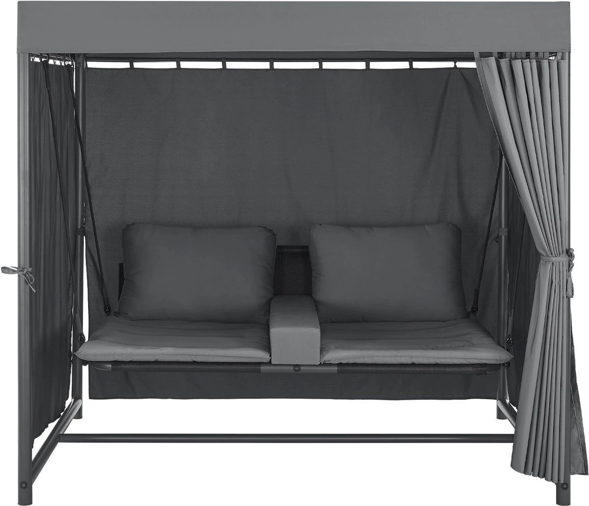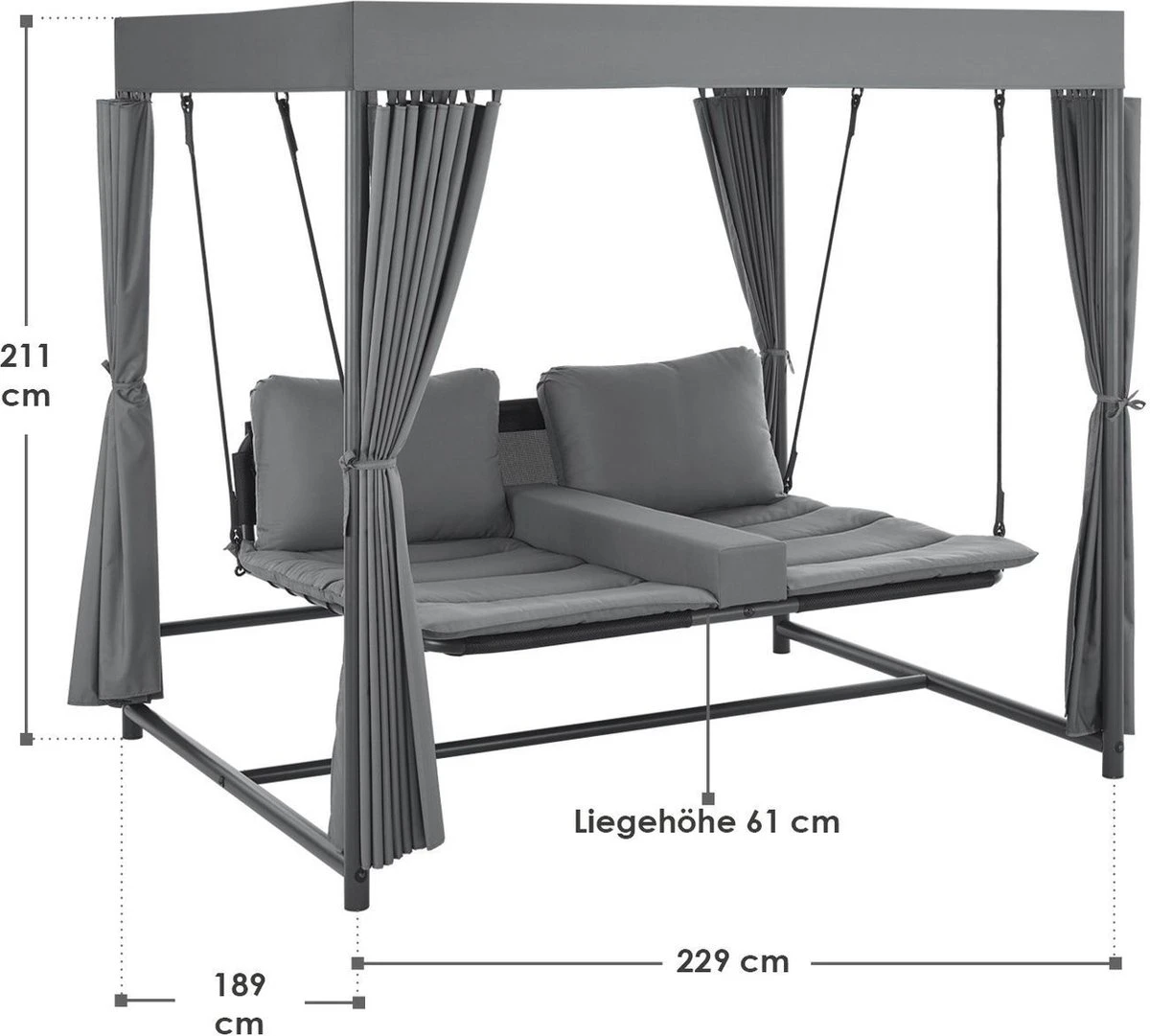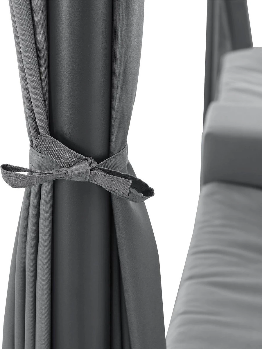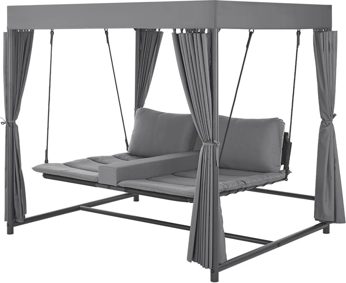 Het elegante schommelbed Kassandra is het nieuwe middelpunt van je tuin om je voeten op te leggen en te genieten van de zomer. Ontworpen in de stijl van een Balinees bed, zorgt het voor ontspannen schommelen dankzij het vrij hangende ligvlak. Modern en exotisch, zoals op vakantie in de Stille Zuidzee, zal deze tuinligstoel een blikvanger zijn in elke wellness-oase. Het dak en de gordijnen aan weerszijden zorgen voor veel privacy en beschermen tegelijkertijd tegen te veel zon en lichte wind. Ontworpen voor 2 personen, kunt u samen ontsnappen aan het dagelijkse leven en wegzweven als op wolken.